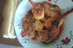 Se curata cartofii si se taie cuburi mai mari, ceapa si ardeiul se taie julien. Se pun legumele in tava, se adauga pulpele , (taiate separat copanelul de pulpa)1 cana de apa, ulei. Se pune peste pulpe cele 2 linguri de bulion,se pudreaza cu ardei boia iute, se adauga un praf de sare si...