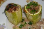 Se taie dovleceii in 3 sau 4, sa rezulte butoiase cam de 5-6 cm inaltime si se curata coaja (eu am curatat doar o parte). Se scobeste fiecare butoias de dovlecel cu o lingurita, dar cu grija sa ramana la baza cam 1 cm grosime si taiem marunt dovlecelul scos din butoiase. Ceapa se caleste in...
